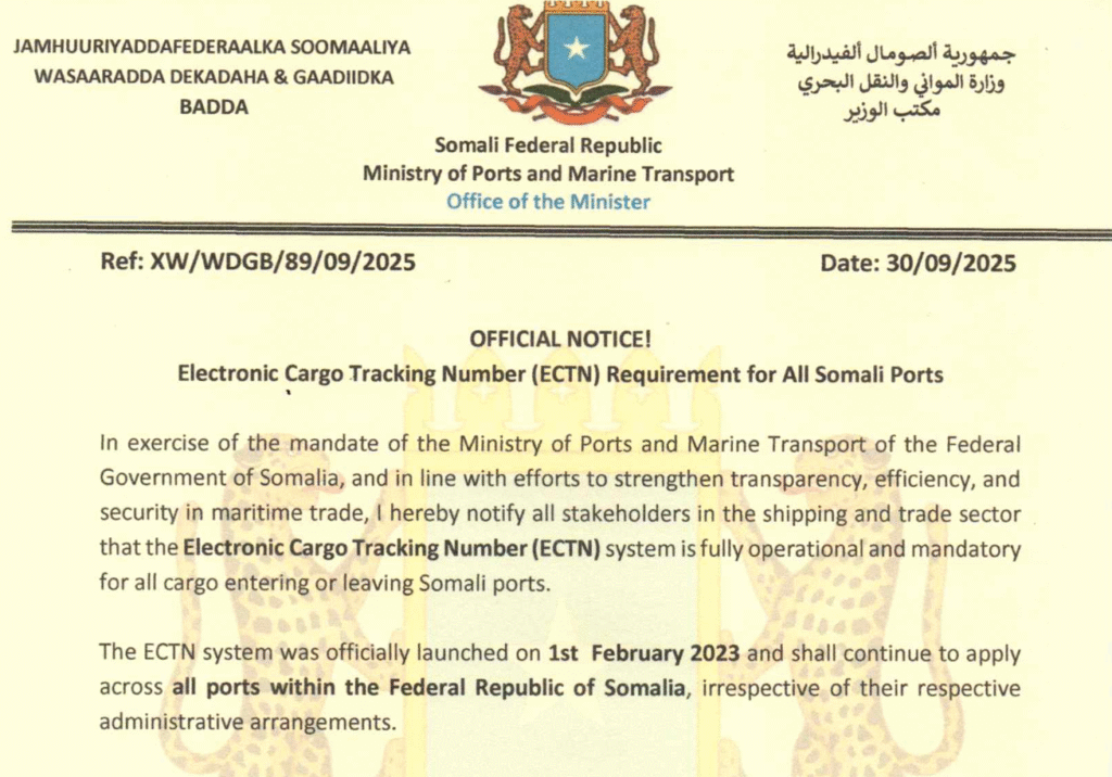 As directed by the Ministry of Ports and Marine Transport (Ref. No. XW/WDGB/89/09/2025, dated 30 September 2025), effective 14 October 2025, all containers arriving at all ports within the Federal Republic of Somalia, must be accompanied by a valid Electronic Cargo Tracking Number (ECTN).